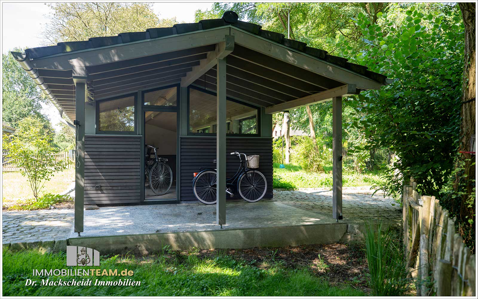 Weitere Gebäude: Carport für 3 PKW (ca 79 qm) mit der Möglichkeit zur Schließung | Farradgebäude (saniert), 1 Holz-Schuppen